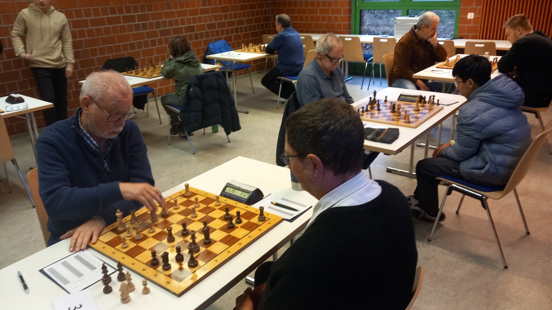 Ich war als Ersatz an Brett 6 eingesprungen. Meine Gegnerin spielte sehr resolut und zielbewusst, ich dagegen wie ein Anfänger und verlor im Nullkommanichts. Kurz danach vereinbarte Bernd Thiel an Brett 1 ein Remis mit seinem Gegner, da die Stellung festgefahren war. Dies machte Joachim Talarski (Brett 2) ebenfalls eine Stunde später; er ärgerte sich, weil er seine zwei Mehrbauern nicht gewinnbringend verwerten konnte. Der Kampf an den restlichen drei Brettern dauerte mehr als drei Stunden. Nikolaus von Blumenthal (Brett 3) sah keine Gewinnmöglichkeit und bot ein Remis an.