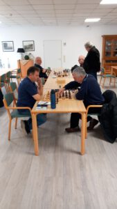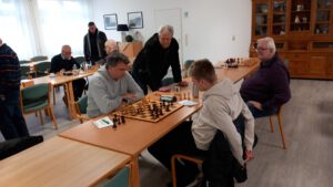 An den drei anderen Brettern wurde noch intensiv gespielt. Achim Raasch (Brett 4) schätzte seine Partie so ein: „Ich kam im Mittelspiel schwer in die Bredouille, rettete mich aber bis ins Endspiel. Aufgrund der Zeitnot bot er dem Gegner ein Remis an, welches angenommen wurde.“